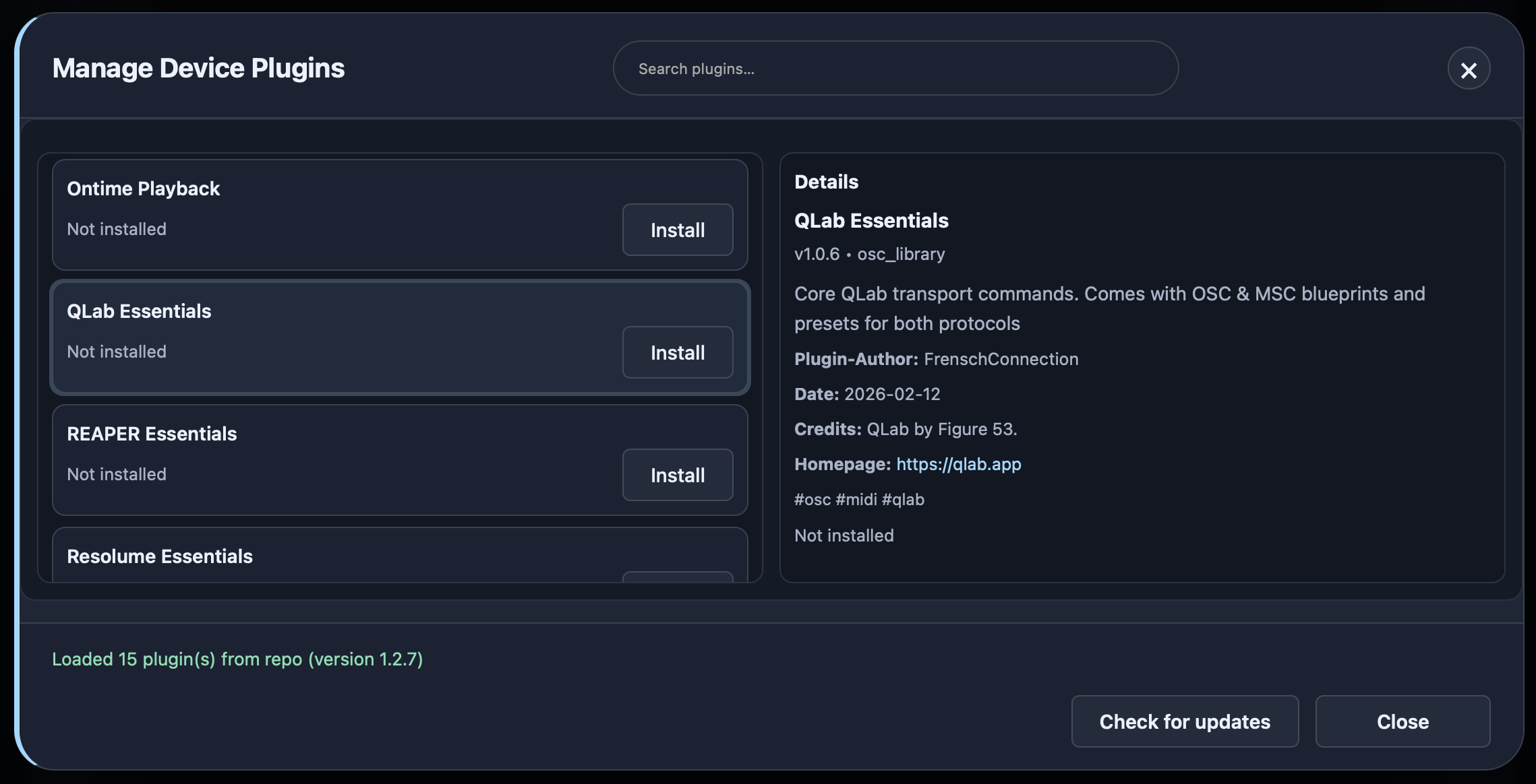 Plugins can be installed and uninstalled here. They include command templates for a wide range of software and hardware, along with presets that can be easily loaded in Custom Mode.